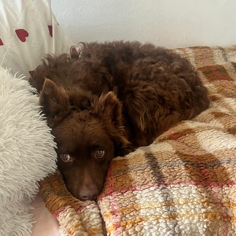 Er war von Tag 1 an stubenrein und insgesamt unglaublich unkompliziert. Mit jedem Tag wird er sicherer, er geht ganz brav an der Leine, bellt andere Hunde nie an und spielt sehr gern Fang mit mir, wenn keine anderen Hunde zum Spielen dabei sind. Er ist noch ein bisschen schüchtern gegenüber Artgenossen und unsicher bei Männern, aber das sind Dinge, an denen wir gut arbeiten können. Außerdem ist er ein richtiger Mähdrescher – er nimmt jedes Leckerchen begeistert an – und hat heute sogar mein Bett okkupiert. Er wird von jedem bewundert und ich kann stolz erzählen, dass er aus einem Tierheim kommt.