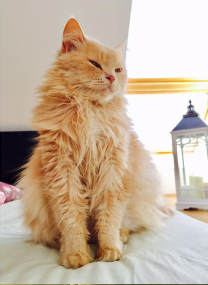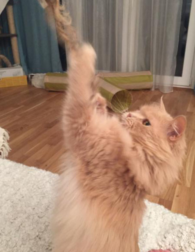 Sie isst sehr gerne, kuschelt, und spielt die ganze Zeit mit uns und ihren neuen Schwesterkatzen :)