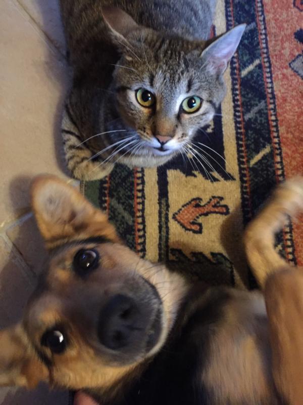 Ich lerne langsam, dass ich mich in meiner neuen Welt vor fast nichts und niemandem fürchten muss und das ich mein Futter nicht selbst erlegen muss. Mein großer Hovawart-Freund Tyko hilft mir – wenn es nötig ist - über Unsicherheiten hinweg – wir verstehen uns super, er passt auf mich auf. Auch mit den 2 Katzen im Haus spiele ich wirklich gerne.