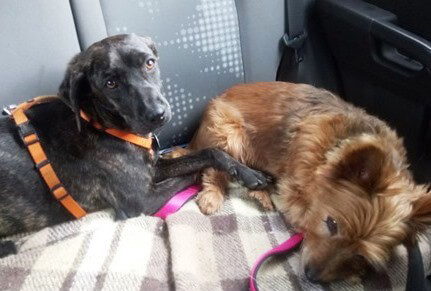 Scylar hat sich in null komma nix eingewöhnt und liebt die alte Terrier Hündin Maya sehr ! Und mit der Seniorin Trivia lässt sichs auch gut Autofahren – zu dritt sind sie gerne unterwegs.