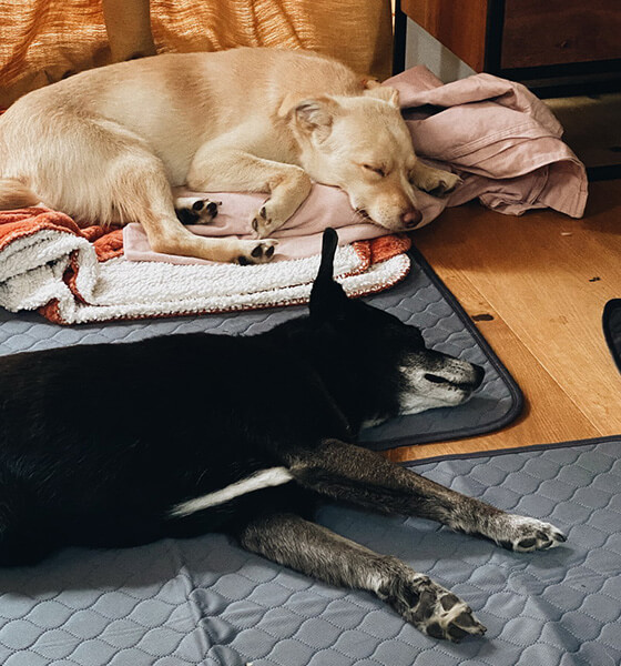 Wir lernen mit jedem Mal damit umzugehen. Heute haben wir ihm eine offene Hundebox eingerichtet, damit er, wenn er es möchte, einen sicheren Rückzugsort hat.