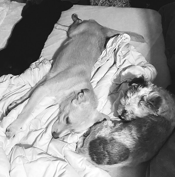 Wir haben gelernt, dass er viel Ruhe und eine fixe Routine braucht. Unsere Lilly hat angefangen ihn sanft zu erziehen ... wenn er zu aufgeregt ist, dann macht sie ihn darauf aufmerksam. Jetzt gerade liege ich mit dem ganzen Rudel entspannt im Bett und wir hören klassische Musik - das scheint den Snoopy zu entspannen.