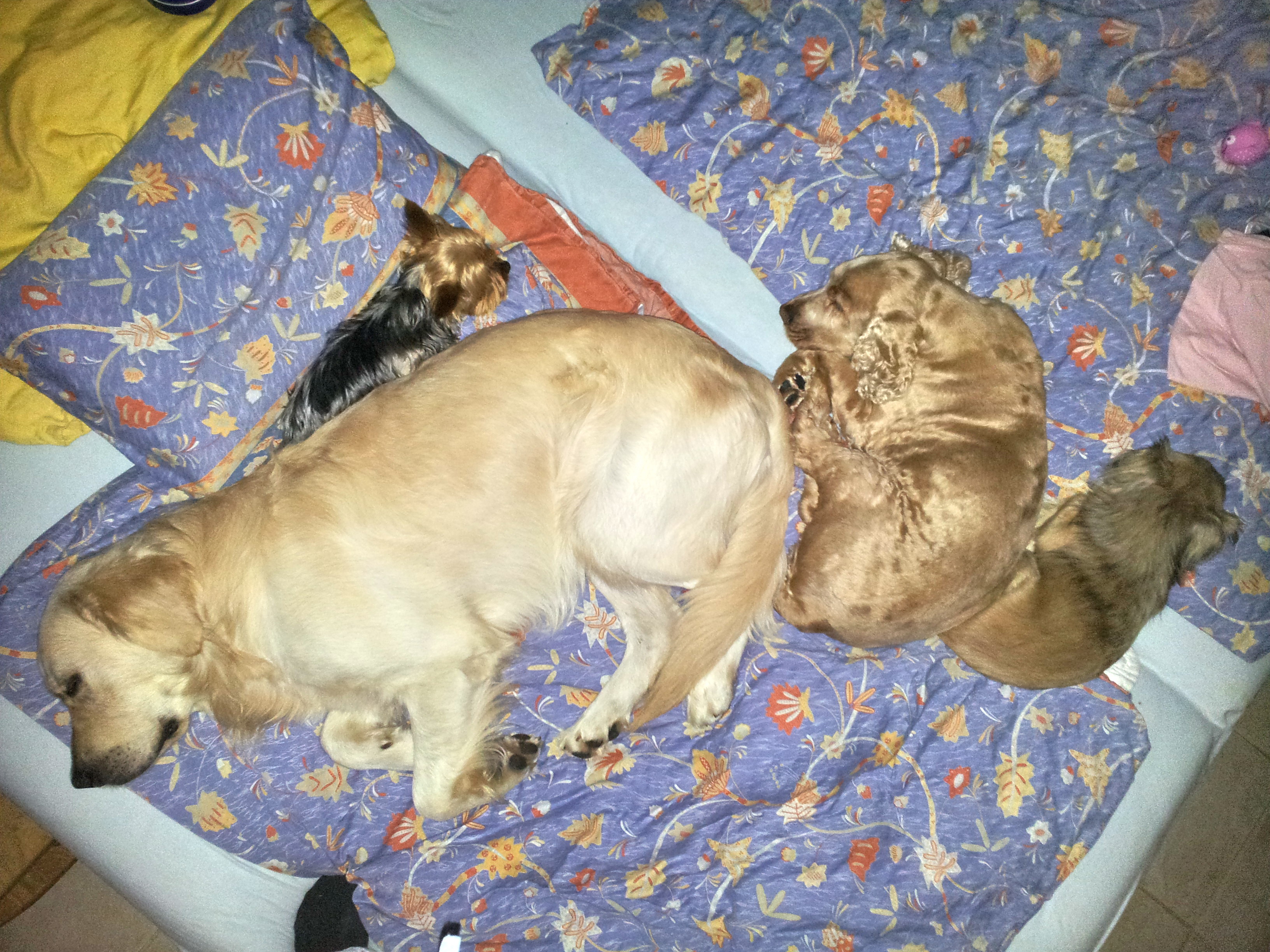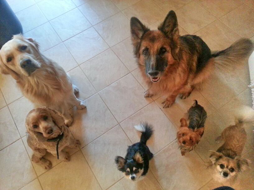 Unser Rudel besteht aus Becky (Schäferhund), Teddy (Retriever/aus dem Tierheim), Charlie (Cocker/aus dem Tierheim) und die Chihuahuas Fly (schwarz) und Lionel (braun). Alle meine Hunde haben mich bei der Resozialisierung von Tinkerbell unterstützt und so konnte sie ihre Ängste schnell ablegen.