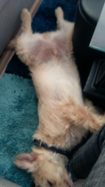 Er ist stubenrein, von der ersten Minute an und bei mir auf der Arbeit gefällt es ihm auch, weil er zu jedem sehr sehr freundlich ist und von jedem gestreichelt wird. Er lässt sich sehr leicht überzeugen, wenn eine Situation kommt wo er unsicher wird, dass es doch nicht so schlimm ist! Anbei ein Foto, wie er im Wohnzimmer schläft!