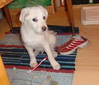 Vor zwei Tagen haben wir auch gleich um die Ecke einen drei Monate alten Welpen getroffen, und haben die Nummer dessen Besitzer bekommen, damit die beiden öfter mal spielen können. Es gibt da in der Umgebung nicht so viele Welpen und außer in der Hundeschule kann er selten mit Welpen toben, das macht ihm halt schon am meisten Spaß.