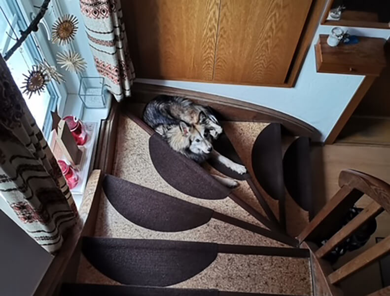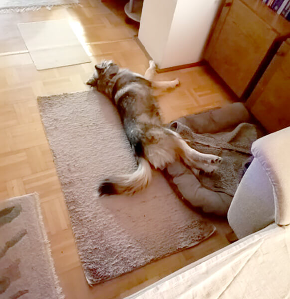 Unsere Gassi-Runden haben sich von 5 Minuten (20m vom Gartentor weg und wieder zurück) auf stolze 60 Minuten gesteigert. Valik liebt es, seine Umgebung zu erkunden. Nase und Ohren sind auf unseren Spaziergängen im Dauereinsatz. Begegnen wir anderen Hunden an der Leine, ignoriert Valik sie völlig. Er geht einfach kommentarlos weiter. Dieses Verhalten kommt uns sehr entgegen, da wir ihn im Gelände noch nicht von der Leine lassen wollen. In der Freilaufzone ist er ebenfalls komplett gechillt. Einen richtigen Spiel-Kumpel haben wir noch nicht gefunden, aber das wird bestimmt noch 😉 Alleine bleiben wird so nebenbei geübt. Mal geh ich in den Keller, mal kurz vor die Tür. Immer wenn ich zurück komme, liegt Hundchen völlig entspannt da. Er darf im Haus überall hin mit, aber wenns ihm zu langweilig wird (wenn ich z.B. im Bad zu lange trödle) geht er runter, sucht sich ein gemütliches Plätzchen und wartet, bis ich fertig bin.