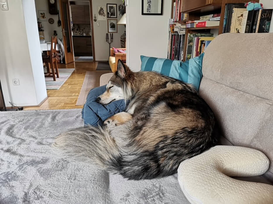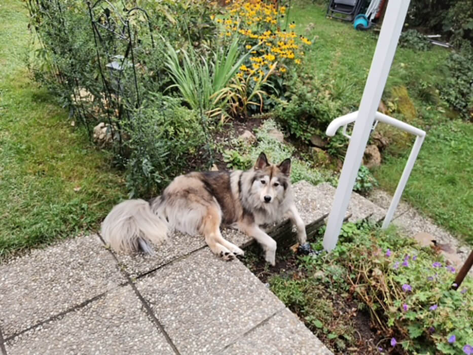 Überhaupt haben wir hauptsächlich Fotos, auf denen der kleine Wolf irgendwo herumliegt. 😅 Diesen Bildern voraus gehen aber oft lange Spaziergänge oder eine wilde Jagd durch den Garten 😉