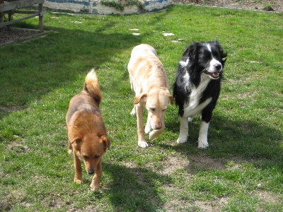 In der Rangordnung hat sie sich genau dort eingegliedert, wo ich es vermutet habe. Und zwar zwischen Lilly (Labradormischlingsmädchen) die ein geborenes Alpha Weibchen ist und Zuri (Border Collie) der ein absoluter Schnösel ist. Durch diese neue Konstellation denke ich, werden alle drei profitieren. Anhand von den Bildern und den kleinen Video kann man es schon ansatzweise sehr gut erkennen. Auf alle Fälle ist dieses Rudel sehr ausgeglichen und mit den zwei soveränen Mädchen wird Zuri auch selbstsicherer. Es ist von ersten Tag an ein harmonisches Rudel gewesen, wobei wir die Zusammenführung zwischen Viki und den anderen Zwei sorgfälltig geplant haben und natürlich auf neutralen Boden ausgeführt haben. Mit den Katzen muß ich etwas aufpassen, den sie dentiert zum spielen/jagen, und das kann ich nicht zulassen weil sonst würde irgendwann eine Gruppendynamic unter den Hunden entstehen und da hätten die Katzen keine Chance mehr. Mit den Papageien war es so, dass Viki am Anfang etwas eingeschüchtert war, wenn diese geflogen sind. Mittlerweile würde sie diese auch gerne jagen, was ich auch nicht tolerieren kann. Da sie uns als Rudelführer aber sofort akzeptiert hat, sind diese Korrekturen sehr leicht zu bewerkstelligen.