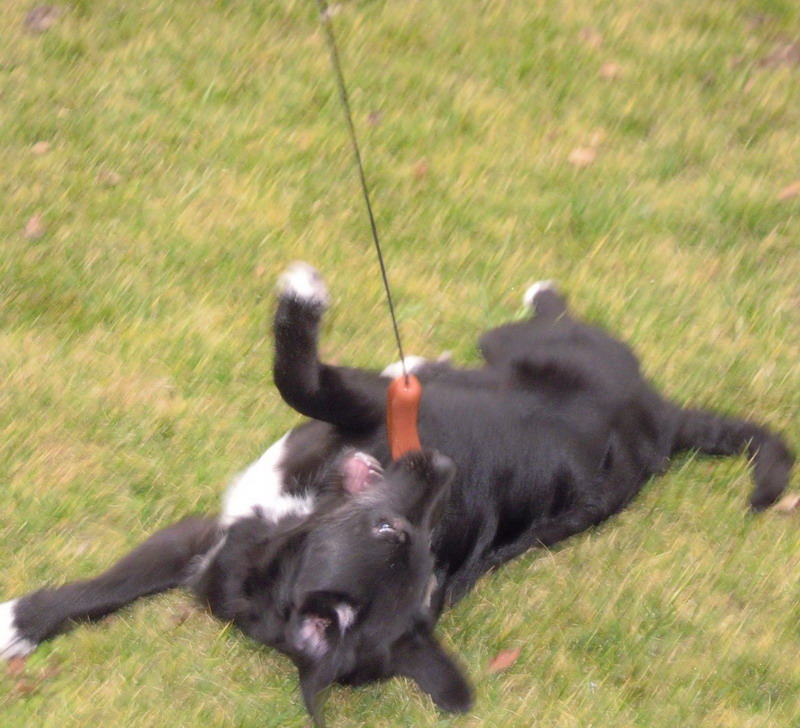 Mit unserem Kater Charley versteht sie sich nicht so gut, aber das liegt nicht an ihr sondern an ihm. Er ist es so gewöhnt im Mittelpunkt zu stehen, dass er das jetzt gar nicht toll findet auch einmal in den Hintergrund zu rutschen. Der Garten ist für sie ein toller Ort. Wenn ich mit ihr hinausgehe und zum Beispiel Unkraut jäte muss unsere Prinzessin natürlich auch gleich Löcher graben. Aber am aller Liebsten spielt sie mit ihrer Hundeangel. Zwei Meter lang und vorne eine lachende, quietschende Hundewurst dran. Das ist immer ein Heiden Spaß. Oft ist sie noch recht unkoordiniert mit ihren Füßchen, das dazu führt, dass sie oft einen oder zwei Purzelbäume macht. Sie gibt immer so viel Gas, dass sie einfach nicht mehr stehen bleiben kann. Erst gestern hat sie einen Sprint auf uns zugemacht und ist bei vollem Tempo in eine Mulde gestiegen und zack, ist sie mit dem Kopf im Gatsch gelandet. Doch ich glaube, das süßeste an ihr sind die wackelnden Ohren wenn sie läuft. Aber nicht nur ihr tut das Spazieren gut, sondern auch mir, ich habe ein ganzes Kilo abgenommen.
