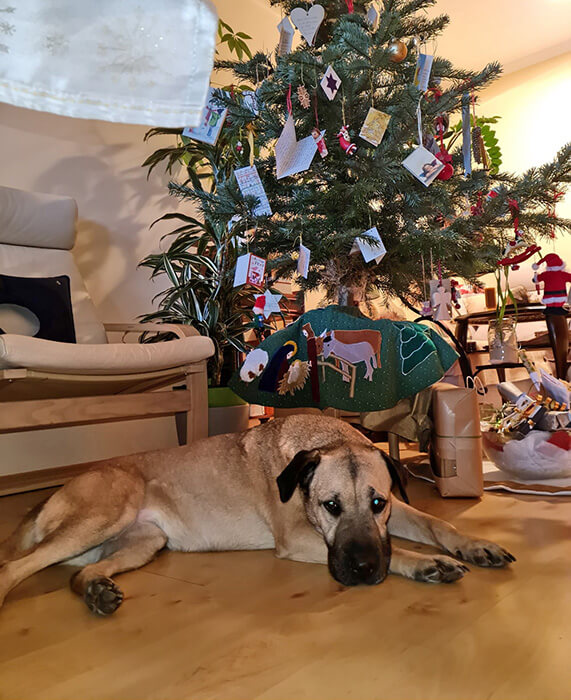 Lift und Treppenhaus stellen kein Problem mehr dar und den Beißkorb nimmt sie auch schon positiv an. Da sie sich scheinbar wohl fühlt und neue Situationen schnell annehmen kann, sind wir am Heiligabend mit dem Zug zu den Schwiegereltern nach Pressbaum gefahren, die Zugfahrt war sehr entspannt. Sie kann sich in einer neuen Umgebung nach anfänglichem Erkunden schnell entspannen. Das war uns wichtig, sonst wären wir wieder heimgefahren. Alle lieben sie!