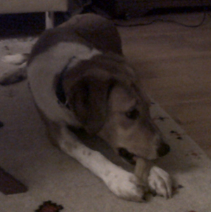 Aki kaut gerade friedlich an seinem Kauknochen und freut sich des Lebens.