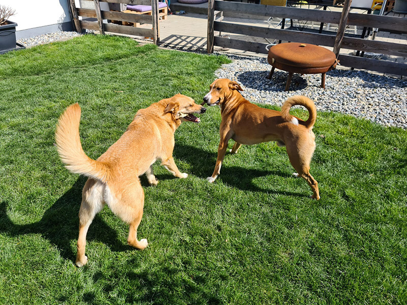Sie hat angefangen Stöcke zu holen und Fliegen zu jagen 🤣. Auf den Fotos sind auch zwei ihrer vierbeinigen Freunde 🐶 Lg