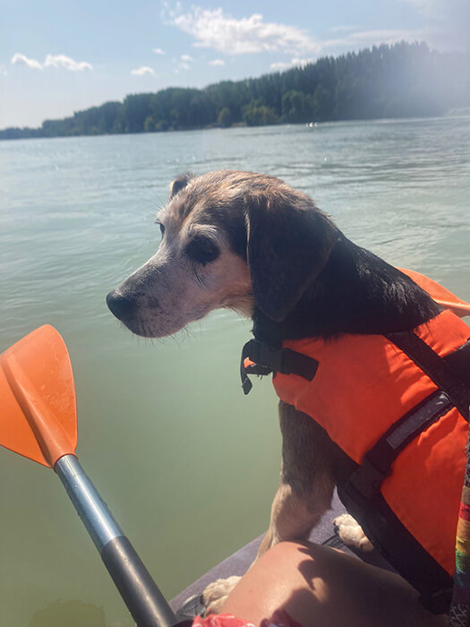Bella, ein am 1. März 2010 geborener Beagle-Dackel-Mix, kam damals durch die Vermittlung von Claudia Böhm zu mir und meiner damaligen Partnerin. Auch wenn sie vor etwa zwei Jahren an Diabetes erkrankte und man mittlerweile bemerkt, dass sie langsam älter wird, ist sie immer noch sehr aktiv, fit und freundlich. Ihre fast 15 Jahre sieht und merkt man ihr wirklich nicht an! Bella ist nach wie vor für jedes Abenteuer zu haben und liebt es, die Welt zu erkunden.