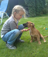 In der Hundeschule hat sie mittlerweile viel Spass dabei, mit den anderen Welpen zu balgen und das Lernen ist kein Problem, wenn der Sturschädel gerade Lust darauf hat :).