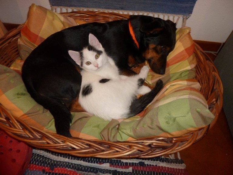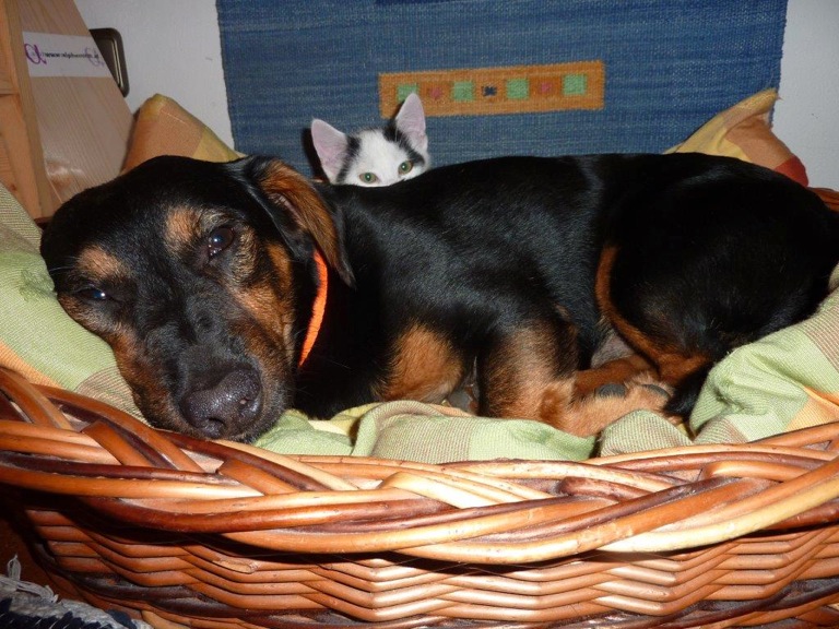Am Pfingstmontag ist dann noch unser Kater "Fridolin" bei uns eingezogen, (eine Überraschung einer meiner Töchter) und ich brauche wohl nichts sagen, die Fotos zeigen es! Es ist einfach nur schön zu schauen wie sie spielen und wie er auf ihn aufpasst.