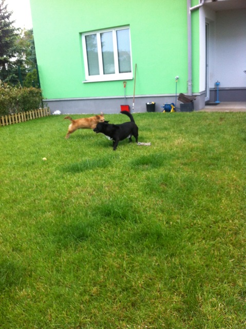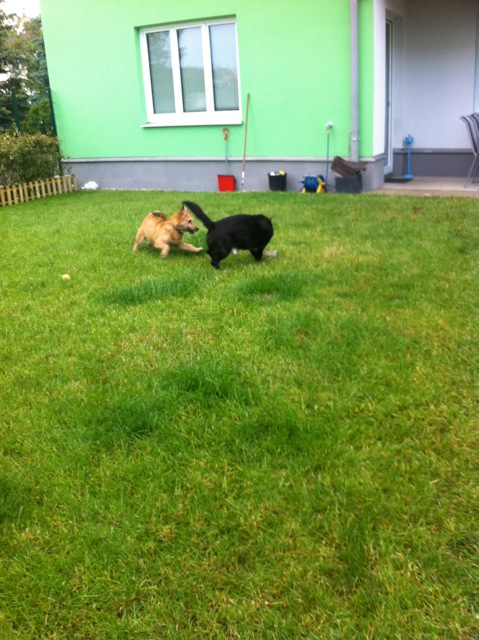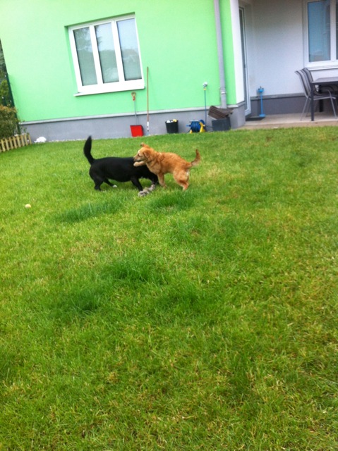 Er hat auch schon einen Freund gefunden. Lucky der Hund unserer Nachbarn, die beiden Spielen fast jeden Tag miteinander! Da kann es schon mal wild zu gehen und Buddy kann ziemlich lästig sein aber Lucky ist ein ganz lieber und er weist ihn auf nette Art in seine Schranken!