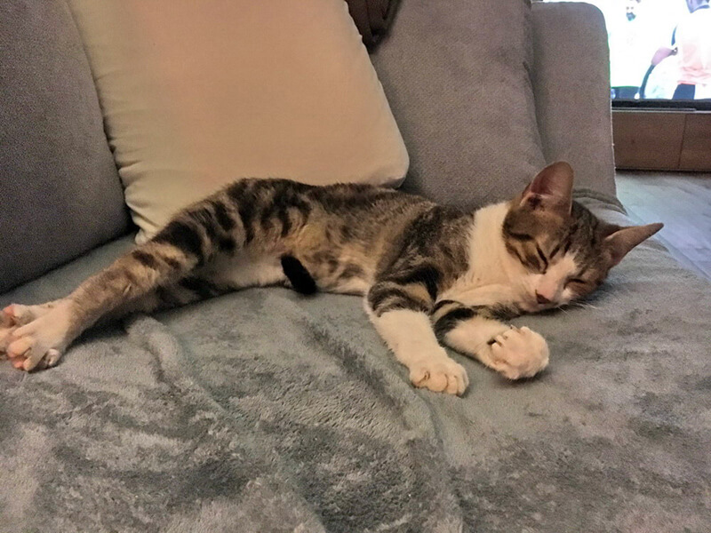 Jetzt grad ist er ziemlich entspannt auf der Couch und sieht fern mit uns.