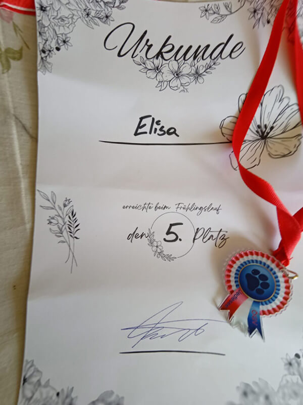 Das erste Semester der Begleithundeausbildung haben wir sehr gut abgeschlossen und beim abschließenden Hundelauf war ich dann sehr stolz auf Elisa weil der Rückruf auf 60 Meter so gut gegangen ist, auch wenn sie beim Einlaufen ins Zielgelände ein bisschen verunsichert war und gezögert hat. Aber dann hat sie das Rennen doch souverän abgeschlossen.