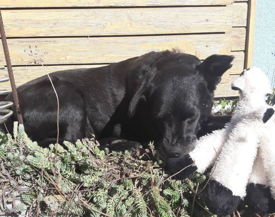 Im Anhang sende ich Ihnen noch aktuelle Bilder von Ella in ihrer neuen Umgebung. Ihr Lieblingsplatz auf unserer Terrasse ist ein Pflanztrog, in dem mittlerweile etwas weniger Grün wächst, da alles platt gedrückt ist ;-). Sie knabbert dann gerne an ihrem Kuscheltier.