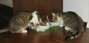 Wir haben ein alte Bettdecke auf der Boden gelegt, darunter verstecken die beiden ihren Mäuse (und findet sie wieder).