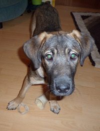 Da er ein großer Herumkauer ist, bekommt er regelmäßig Kauknochen im XXXL Format, die er dann stolz tagelang durch das Haus schleppt (und wehe eine der Katzen schnuppert dran!). Die Katzen sind ihm immer noch ein wenig suspekt.