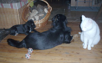 wie versprochen einige Fotos von unserer Kyra, Purzl und unseren anderen Hunden. Kyra bereitet uns alle große Freude, auch den restlichen Familienmitgliedern, Joye (Labradormann), Cindy (Maltesermädchen aus dem Tierheim), Mädi (Dackelmädchen), Cändy (Mädchen aus Thailand), Cooper (Rauhaardackel aus Ungarn), Nelly (von Kebabstand gerettet) und natürlich mein Purzel (aus Nitra) und Blacky, unsere weiße türkische Katze.