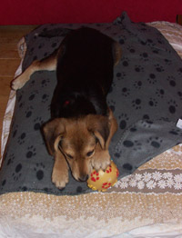 Momentan schläft sie auf ihrem riesigen Hundebett - wie erholsam auch für mich! (Ich hab ihre Größe total falsch eingeschätzt, darum hat sie jetzt ein "Hundedoppelbett" für sich alleine)