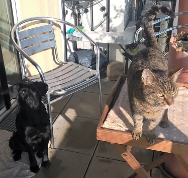 Jetzt schreibe ich Ihnen sitzend mit beiden am Balkon in der Sonne, er kneift die Augen zusammen, liegt in der Sonne und ich glaube er genießt sein neues Leben! Wir unseres auch!