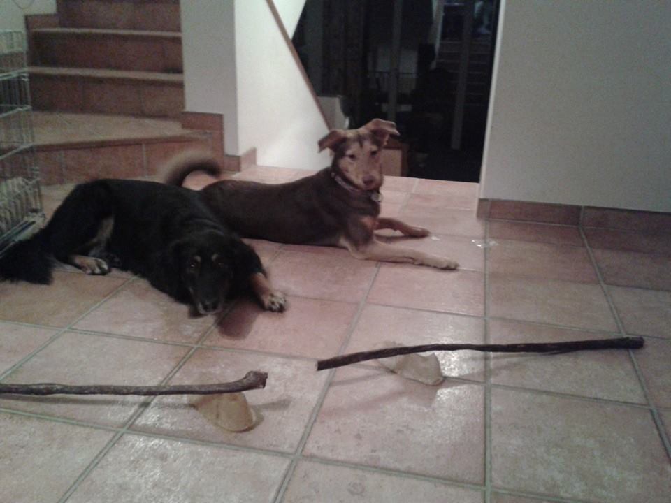 wo fang ich bloß an? Wir haben im September mit der Hundeschule angefangen. Mimi hat super mitgemacht und es war eigentlich verblüffend einfach, ihr etwas beizubringen. Und so konnten wir letzten Samstag schon zur Begleitunghunde- (BH-) Prüfung antreten. Wegen dem Regen-Matsch-Wetter hatten wir etwas Schwierigkeiten beim Ablegen, aber in der Fußarbeit hat sie eine Leistung gezeigt, die so manchen Rassehund in den Schatten stellt. Auch der Verkehrsteil war ohne Beanstandung und so haben wir locker bestanden. Kimba hat ebenfalls ihre Prüfung bestanden und so gabs abends dann eine riesen Belohnung für die beiden- auch wenn das Posieren fürs Foto etwas knifflig war, mit dem großen leckeren Kaui vor der Nase... :-)
