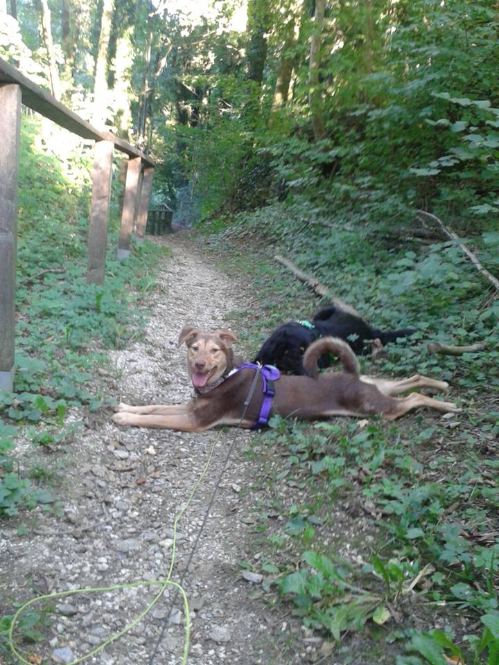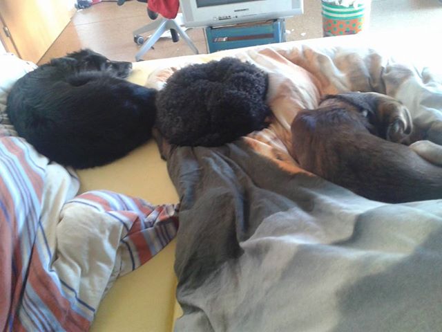 Ich habe mir auch meinen letzten Bericht an euch vom Sommer durchgelesen und muss sagen, seither hat sich wirklich enorm viel getan. Mimi knabbert auch keine Möbel oder Kabel mehr an. Ihr Sozialverhalten ist nun wieder viel sicherer und man kann sie gut mit verschiedenen Hunden frei laufen lassen. Auch hat Mimi die ersten Monate nur am Boden geschlafen - mittlerweile schläft sie bei uns im Bett, vorzugsweise auf meinen Beinen oder zwischen meinem Mann und mir - was ich in ihrem Fall auch zulasse und sogar als großen, großen Fortschritt werte. Sie kuschelt mit großer Leidenschaft, drückt sich mit ihrem Kopf zu mir her und fällt dann irgendwann in einer Art Purzelbaum neben mir nieder. Ich genieße es, ein richtiges "Rudel" zu haben und auch die Hunde scheinen es zu genießen - Mimi hat das "Rudel" irgendwie stabilisiert, seit sie da ist gibts auch zwischen Cindi und Kimba keinen Streit mehr (die waren früher manchmal im Streit um einen Knochen oder ein Spielzeug aneinandergeraten).