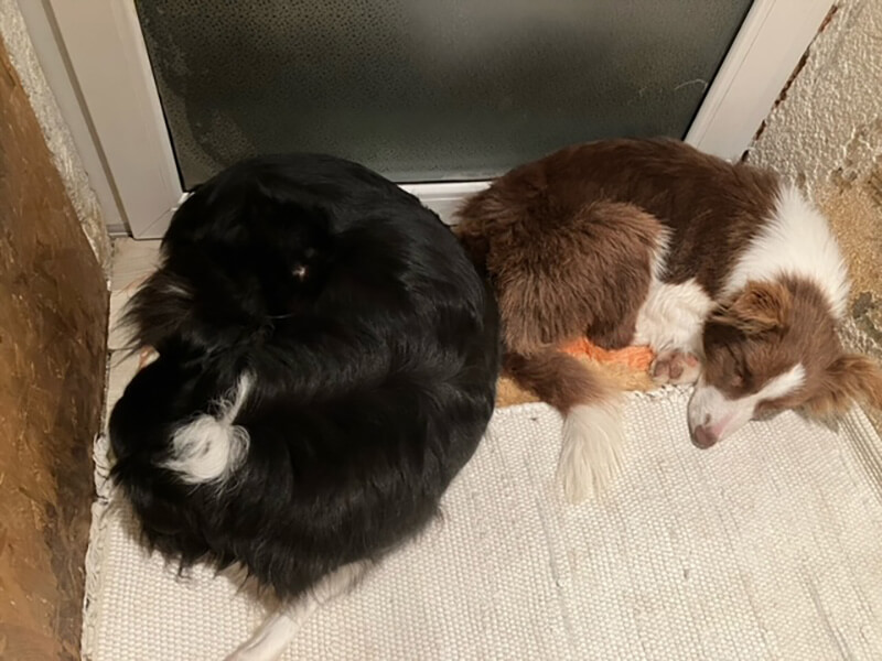 Anfangs war er etwas ängstlich und hat bei uns Sicherheit gesucht. Erst hat er den beiden Damen mal ordentlich die Zähne gezeigt und ein paar mal hingeschnappt nach dem Motto „bevor du mir was tust, tu ich dir was“, das lies Fly und Chelsea aber relativ kalt…. Mit Fly hat er sich gleich angefreundet, sie haben auch schon zusammen auf dem selben Teppich geschlafen!