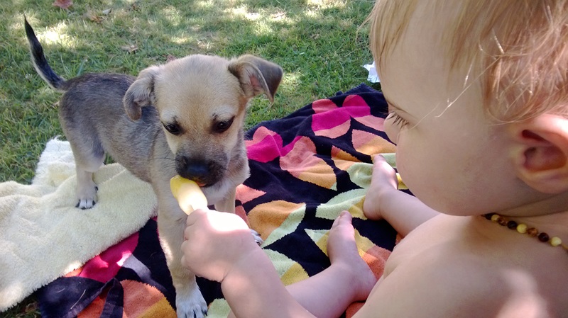 Mojo hat sich sehr schnell bei uns eingelebt und hält uns  ordentlich auf Trab. So wie es sich für einen kleinen Rüden gehört, sind Schuhe und das Kinderspielzeug seine Lieblingsspielsachen, aber mit seinem „ich war das gar nicht“-Blick kann man ihm gar nicht böse sein. Seit ca. 4 Wochen gehen wir in die Welpenschule und mit den richtigen Leckerlies in der Hand kann er auch schon die ersten Befehle.