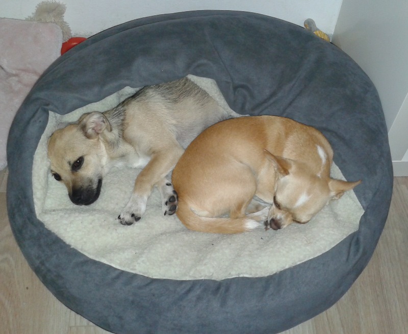 Nach anfänglichen Schwierigkeiten mit unserem Chihuahua-Weibchen, die ständig auf Ihn eifersüchtig war, sind die beiden mittlerweile ein Herz und eine Seele…inzwischen darf Mojo auch im Körbchen mit ihr schlafen.