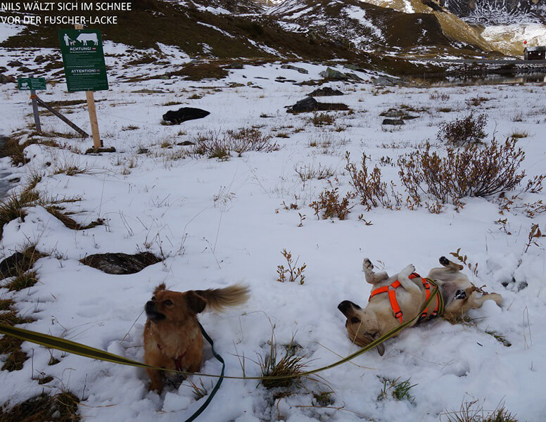 Ab Juli begannen wir dann, ihn leinenführig zu machen, da wir ihn in den Urlaub mitnehmen wollten. Zum Anlegen des Geschirrs mussten wir ihn mit leichtem Druck an einer Flucht hindern, er hatte zwar Angst, verfiel aber nicht in Panik. Sehr schnell hat er mitbekommen, dass Anschirren spazierengehen durch Feld und Wald bedeutet, stellt sich nun von selbst zum Anschirren an und springt ins Auto. An der Leine gehen funktionierte zu unser aller Überraschung sofort ohne Probleme, ich glaube Nils schaut sich bei unseren beiden anderen Hunden viel ab - natürlich auch alle Unarten: Emma ist eine sehr gute "Wächterin", was bedeutet, dass sie auf dem Fensterbrett liegt und alles ausgiebig und langanhaltend verbellt, das sich draussen irgendwie bewegt, genauso im Auto und je nach Laune auch bei der Begegnung mit fremden Hunden. Es war nur eine Frage der Zeit, bis Nils hier mittut, sogar der alte Lenny lässt sich noch manchmals ebenfalls dazu hinreissen.