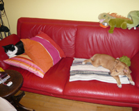 Die beiden Katzen, vor einiger Zeit von Frau Höss übernommen, zeigen ihm deutlich, wer der Herr im Haus ist. Vorallem ist Garfield um einiges schwerer als er.