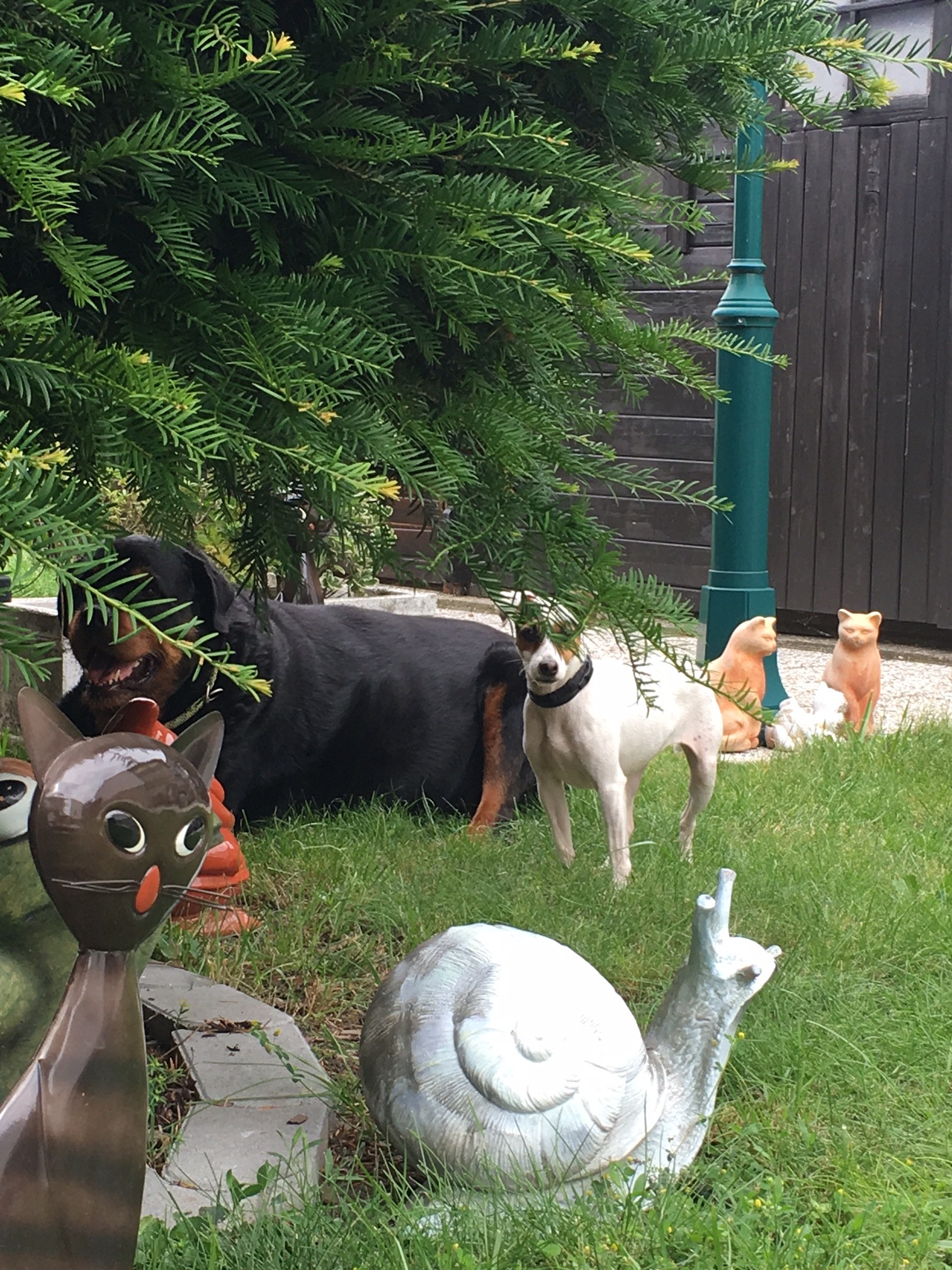 Mit unseren zwei großen kommt sie gut klar (fotos anbei), bei dem einen ist sie sogar schon der Chef da sie ihm klar gemacht hat – bis hier her und nicht weiter :) Sie läuft den zweien richtig nach und schaut was sie tun und warum sie das tun – neugierig ist sie sehr! Sie hat den Garten schon komplett untersucht und sobald was neues wo steht wird das auch kontrolliert – sehr sehr neugierig – nur das erschrockene legt sie schwer ab. Aber wer weis was der kleinen alles wiederfahren ist – wir kriegen das schon hin!