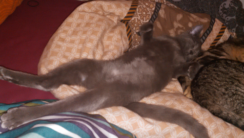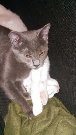 Smokey (Olympia) und Spotty sind zu zwei hübschen, jungen Katzendamen herangewachsen, die viel spielen und super schmusig sind. Sie haben beide einen ganz einzigartigen Charakter. Smokey quasselt viel, gerade mit meinem Freund unterhält sie sich gerne ;) Spotty miaut so gut wie nie, und strahlt viel Ruhe aus. Oft stellt sie sich neben mich und streckt dann ihre Pfoten in die Höhe, an mein Bein, als Zeichen auf den Arm zu wollen. Was ich dann natürlich tue und mit einem lauten Schnurren belohnt werde :) Mit unseren beiden Katern haben sie sich auf Anhieb verstanden und kuscheln alle gerne gemeinsam..das sieht dann aus wie ein riesiger, bunter Fellball :)Wir sind sehr glücklich mit den beiden und bedanken uns für Ihre Hilfe. Ohne Sie und ACA hätten wir diese beiden tollen Katzen nicht kennenlernen können.