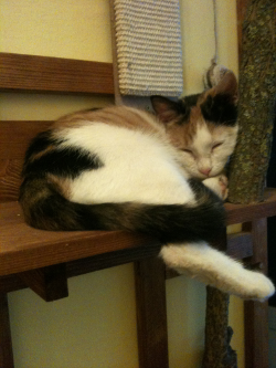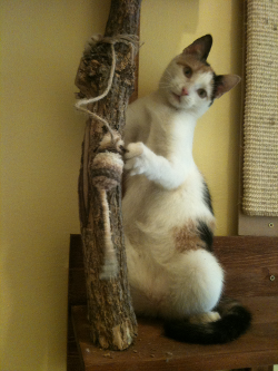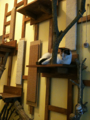(Auf den Fotos ist Spotty auf dem selbstgebauten Kratzbaum zu sehen.)