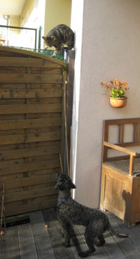 Wenn eine Katze das Grundstück besucht, wird diese natürlich mit höchster Aufmerksamkeit bedacht. Schließlich muss ja klargestellt werden, wer hier das Bellen hat ;-)