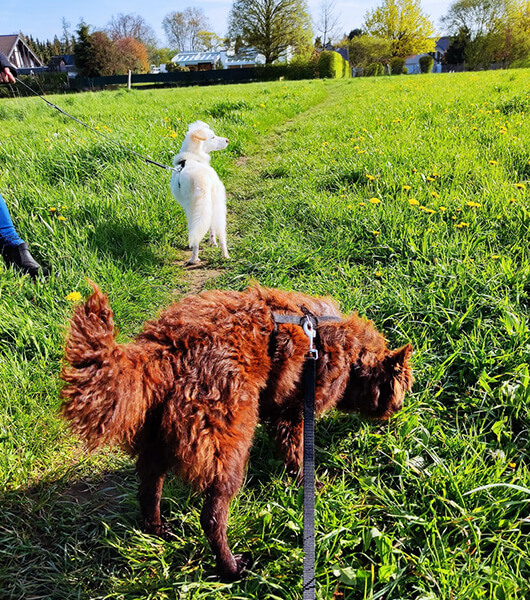 Es gab bereits erste Hundekontakte beim Spaziergang. Auch hier ist sie noch sehr zurückhaltend und braucht Zeit, um sich auf andere Hunde einzulassen.