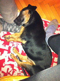 In den darauffolgenden Tagen lernten wir einander kennen und vorallem lernten wir uns auf Tibors Bedürfnisse einzustellen. Mit unglaublicher Geschwindigkeit legte Tibor seine Angst vor den meisten Stadtgeräuschen ab und ging vorbildlich an der Leine. Uns fiel plötzlich auf wieviele Bordsteine und Stufen es auf der Straße gibt und auf wieviele Verkehrszeichen, Ecken, Mülltonnen und Menschenbeine man achten muss, wenn man einen blinden Hund an der Leine hat. Inzwischen sind wir so gut aufeinander eingestellt, dass wir uns ganz automatische die besten Wege für Tibor aussuchen und, zum Beispiel, das Kommando "Stufe" hat Tibor sofort gelernt. Bei jedem Absatz testet er mit der Schnauze wie tief er ist und springt dann hinunter. Er traut sich inzwischen sogar Absätze hinauf und hinunter zu springen die höher sind als er ertasten kann, wenn wir ihn dazu auffordern. Es ist so schön zu sehen wie sehr er uns vertraut.